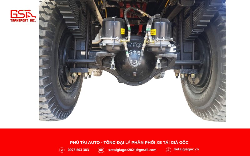 Khung gầm Xe tải ben Chiến Thắng 6T8 làm từ thép chuyên dụng chắc khỏe, chịu tải >10 tấn, tối ưu cho địa hình đồi núi. Nhíp lá 2 tầng tổng 20 lá kết hợp giảm chấn thủy lực, cầu 4×4 với tỷ số 6.33, lốp 9.00-20 bám đường tốt, đảm bảo vận hành ổn định và bền bỉ khi chở tải nặng.