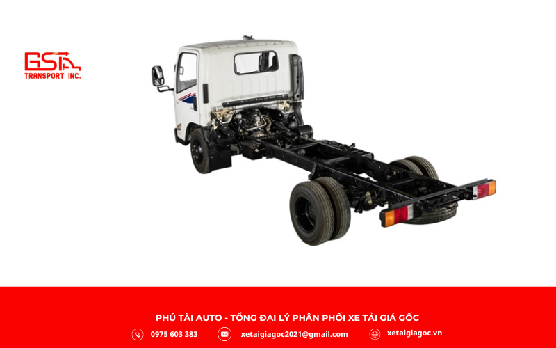 Khung gầm Đô Thành IZ45S được dập nguyên khối từ thép chịu lực cao, bền bỉ và chịu tải tốt. Hệ thống treo nhíp lá kết hợp giảm chấn thủy lực giúp xe vận hành êm ái, ổn định ngay cả khi chở nặng. Khoảng sáng gầm cao cùng lớp sơn tĩnh điện chống gỉ tăng độ bền và khả năng di chuyển linh hoạt, phù hợp cho vận tải nhẹ trong đô thị.