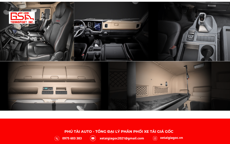 Nội thất JAC DAWOS 8.3 tấn tiện nghi, tập trung thoải mái cho lái xe đường dài. Cabin 3 chỗ, ghế ôm lưng có thể trượt và ngả, không gian rộng, tầm nhìn thoáng. Trang bị đầy đủ: điều hòa, kính chỉnh điện, khóa trung tâm, USB‑MP3/Radio, cùng 2 tấm che nắng và hệ thống làm mát/sưởi kính hỗ trợ quan sát.